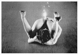 Der Junge schnippt mit den Fingern und Trommelwirbel! Nun kommt der Pudel in Bewegung: er springt über die gespreizten Beine von Candy Candle. Ein herzlicher Applaus.Das Kunststückchen wiederholt sich auf der stets schneller rotierenden Scheibe. Ichbilde mir ein versengtes Pudelhaar zu riechen. Wir hören eine Explosion wie rollender Donner - das Licht fällt aus. Der einzige Lichtschein kommt von dem schwachen Flämmchen der Kerze in Candy'sMöse. Die muskulösen Beine angespannt, unbeweglich wie die Arme eines Kerzenleuchters... Das schwitzende Publikum is mäuschenstill. Plötzlich hebt Candy den Kopf und bläst aus vollen Backen einen langen Schwall Atemzwischen ihre Schenkel. Eine Wolke, ein Regen von Flammen über dem Publikum. Ein See von Fünkchen flimmert auf dem ausgefächerten weißen Kleid. Candy Candle trinkt keinen Champagner, Candy Candle trinkt Feuerwasser en spuckt Flammen zwischen den Beinen. |